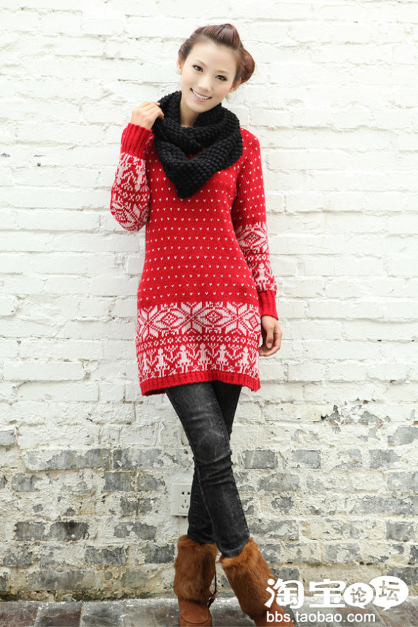 经典图案和点点心形图案的点缀是不是显得特别的乖巧呢,红色的连衣裙让我想起了令人爱怜的小红帽呢,黑色围脖是点睛之处,毛线连衣裙是百搭吸精的款式,窄身牛仔裤和毛绒绒靴子是心机搭配