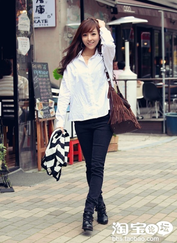 没有收腰的衬衫搭配深色牛仔铅笔裤,