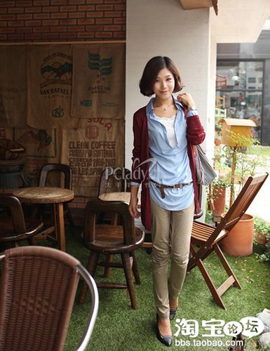 简洁的蕾丝吊带和轻薄的海蓝色衬衫搭配红褐色长款针织衫,