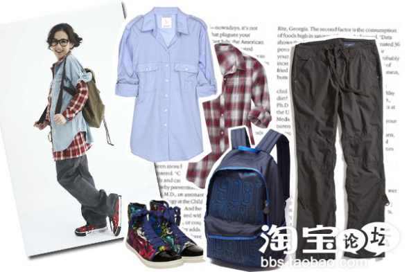 搭配技巧2:红色格纹和牛仔衬衫的叠穿很能表现学院气质,与工装裤的混搭恰到好处地诠释出自然女孩风,走在校园即不突兀,也不会感觉太平淡。没发现吧,你已经是校园中一道靓丽风景线了!