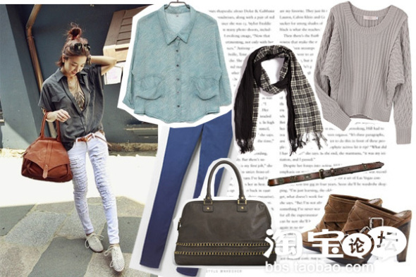搭配技巧2:宽松上装+收腿长裤的搭配,让你看起来更纤细,大气的手提包和今年大热的金属扣包脚高跟鞋,让整体造型更有分量感。