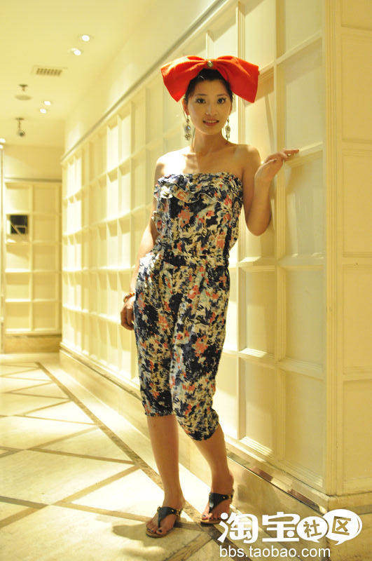 哇......一身抹胸连体裤搭配好大好红的蝴蝶结发饰,好有范儿哟...味道抓牢西啊。。