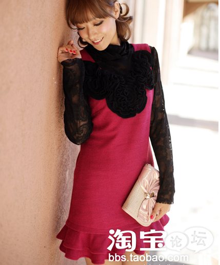 黑色亮面连帽羽绒服+红色打底毛衣裙+咖色流苏靴