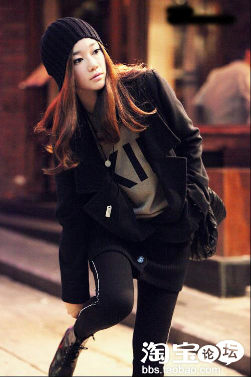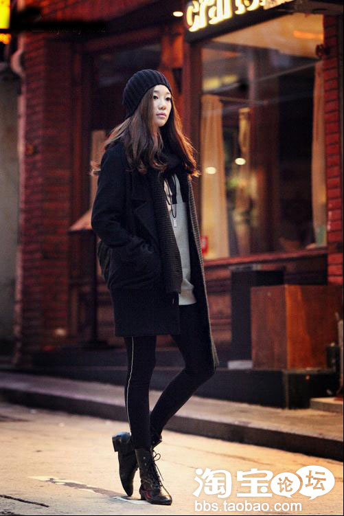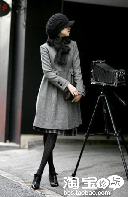 长款呢子大衣,大的V领+yy下端收口设计,把你的圆润的PP收在里面,看不出来胖哦,还有点像穿着个小迷你裙而且还带休闲的感觉,大家要注意要穿黑色的打底裤比较保险哦,比较低的MM们最好不要穿高靴,这样会显得腿比较短!!