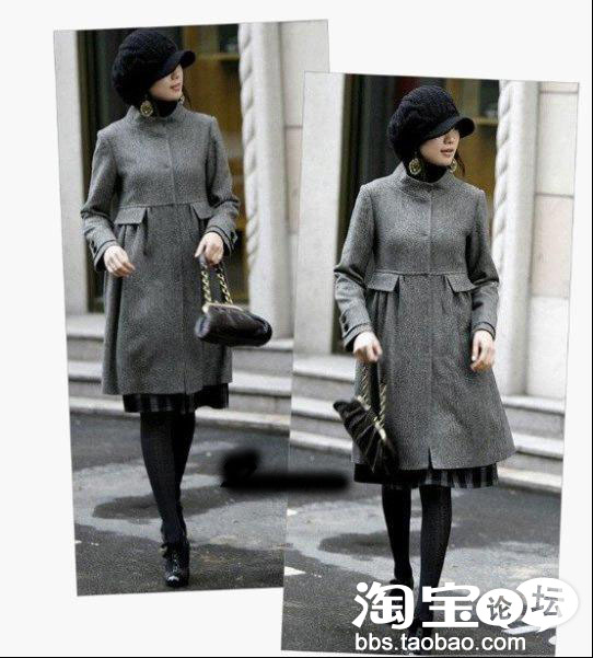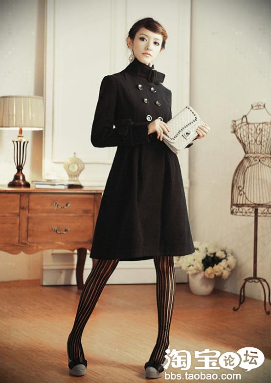 长款的呢子大衣立领设计给人高贵的气质,可以挡住mm们的大pp和大象腿。注意的是她的裤袜。。。是竖条的哦会把腿部的线条拉长很赞!