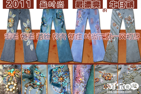 羽毛、蕾丝、钉珠、亮片、贝壳、兔毛,这些时尚的元素都可以融到牛仔裤中,加上美美的设计,真不愧是2011最漂亮的牛仔裤!