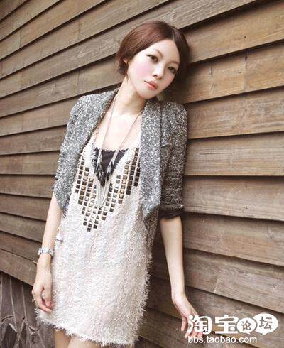 南韩西装小外套都喜欢贴身设计,所以码数比较偏小,150-160的MM可以穿小码,165-170就建议穿中码了,虽然码数偏小,但像这种类型的小外套还是穿紧一点好看。星光点浅灰色尼料是南韩进口面料,有里衬,里衬光滑为黑色,无论干洗水洗都不会变形,小外套半正装,海绵垫肩垫高,是近年来庞克风的延续,加上毛绒背心裙胸前铆钉排扣更容易穿出味道来。