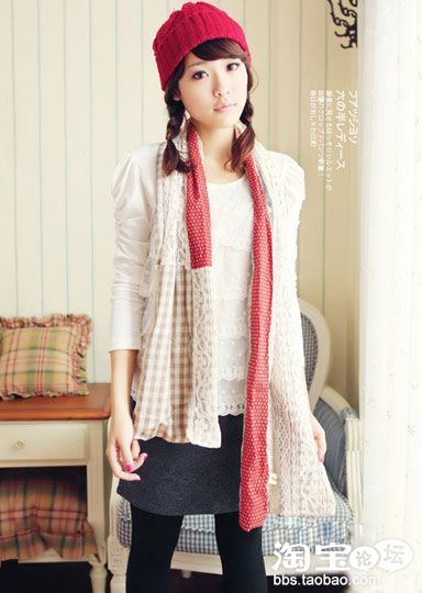 活泼的红底与水玉点点的图案结合,回归童年的感觉,天真童话般但是绝不会显幼稚。整个面的蕾丝拼接带来几分女人味,咖啡色的格纹过渡色,综合了红的跳和白色蕾丝的甜,恰到好处的颜色搭配,双层的厚度秋冬也很适合。