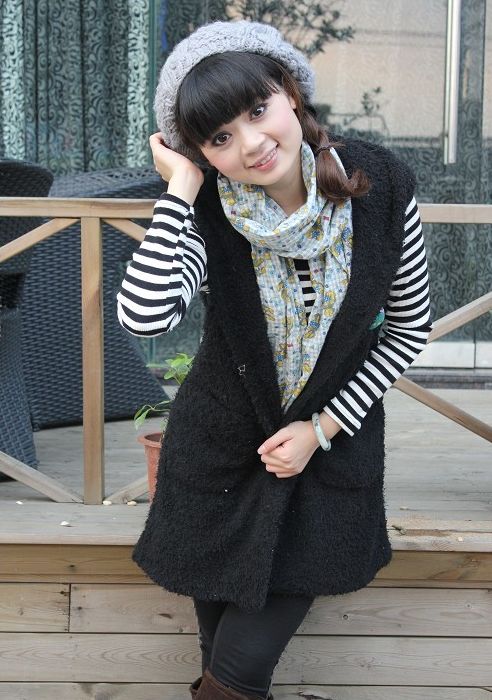 黑色羊毛马甲背心甜美可爱,内搭一件条纹打底衫既简单又时尚,