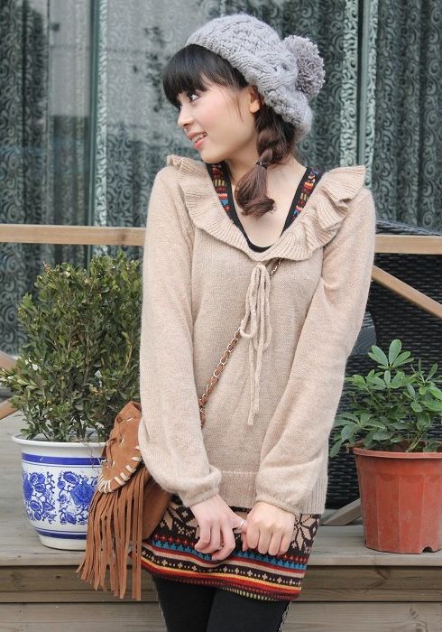 荷叶领免毛衣+民族风背心裙