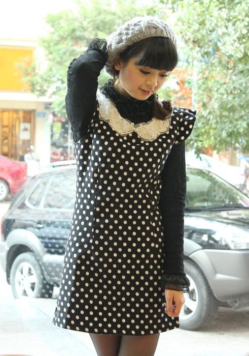 可爱感十足的编织帽让波点多了几分可爱跳跃的味道,黑色波点连衣裙 ,