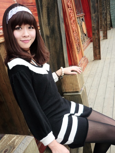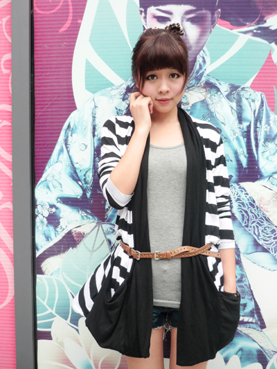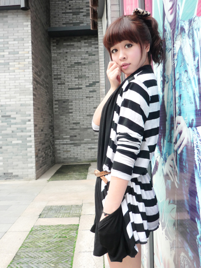 酷酷的黑色搭配欧美的黑白条纹开衫,也可搭配甜美的下装缓冲酷感取得中和。