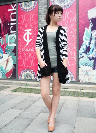 出游的服饰大家首先肯定考虑的舒服最重要,棉质的黑白条纹开衫搭配修身牛仔短裤