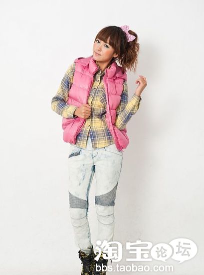 泡泡款的羽绒马甲很挑人穿,搭配薄款的格子衬衣能减少厚重感,下身牛仔裤的拼格能达到丰富层次感的效果。