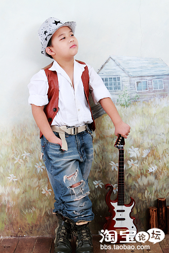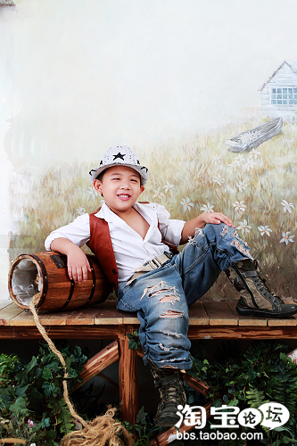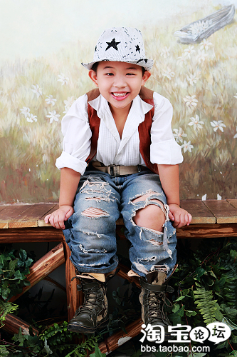 破牛仔+条纹衬衣+帅气马甲+帽子