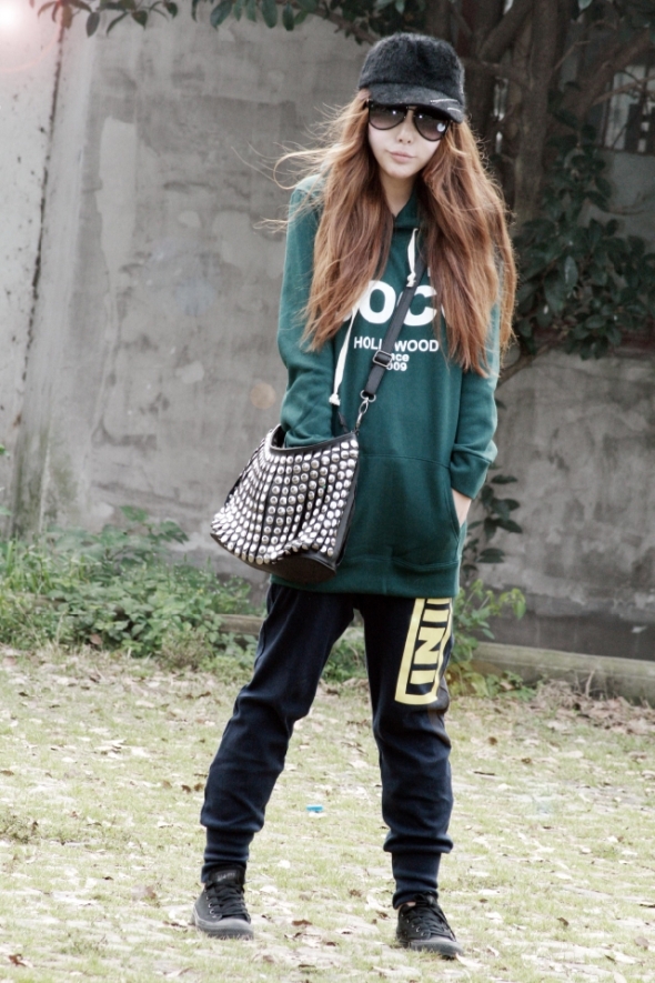 9黑色拉绒带钻棒球帽搭配韩版前卫衣
