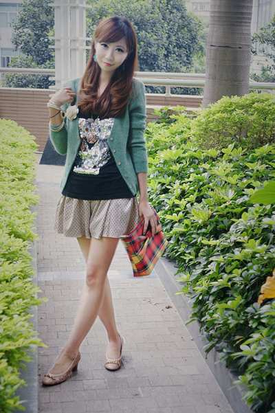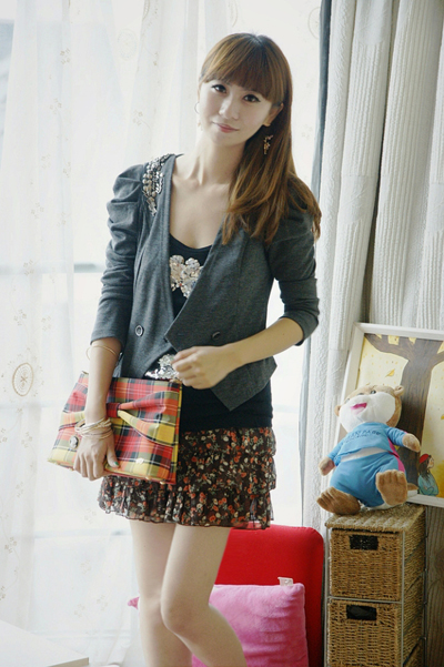 NO3:钉珠耸肩小西装+碎花蛋糕裙+亮片背心