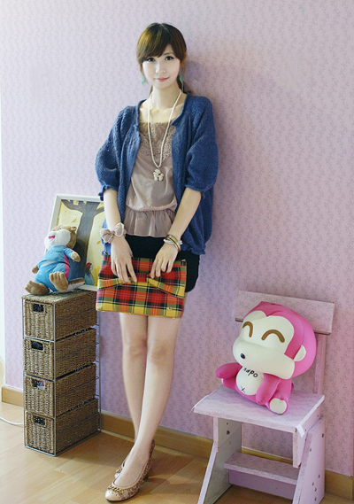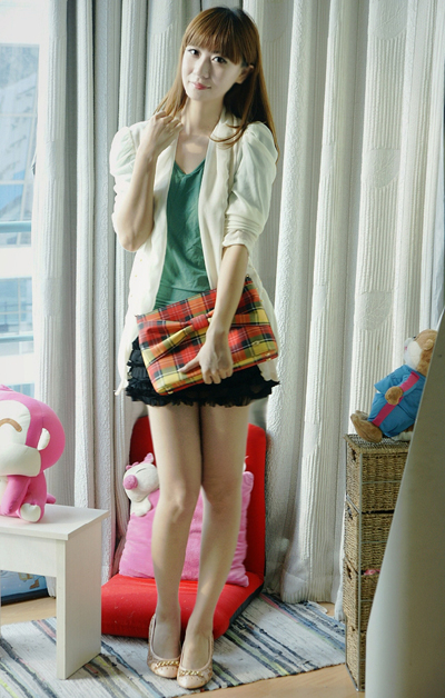 稍显沉闷的色调,搭配黄色小短裙和红色格子包,红色草莓挂件,