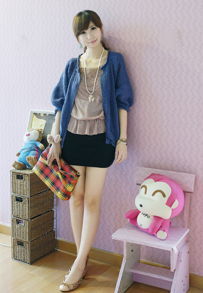 NO4:蓝紫色兔毛七分袖宽松随意毛衣+烟粉色大翻领丝质衬衣+黑色毛呢短裙+可爱珍珠挂件