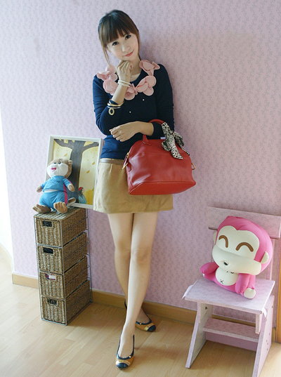 NO5:蓝色长款开衫+粉色裹胸连衣裙+大花朵腰带+大红色手提包