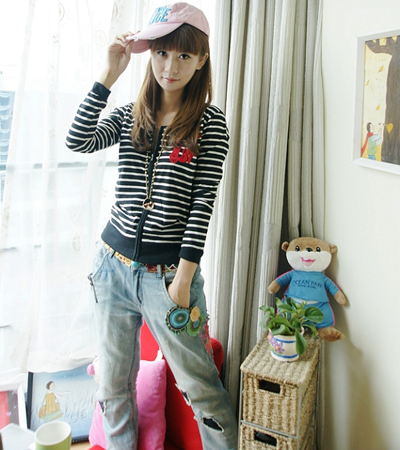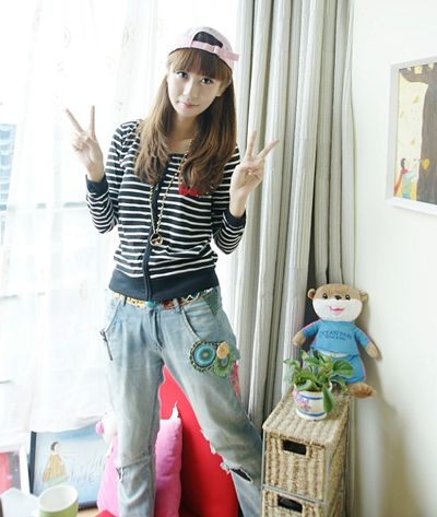 条纹贴花拉链T+钉珠绣花牛仔裤+鸭舌帽