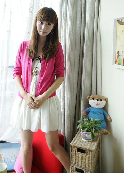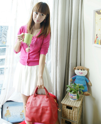 NO9:(1)亮丽玫红开衫+白色纯真连衣裙+大红色手提包
