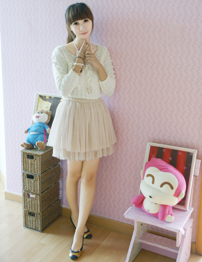 NO12:白色短款粗针葡萄毛衣+层层纱裙+珍珠项链