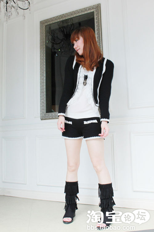 a 黑色蕾丝边外套+黑色蕾丝短裤