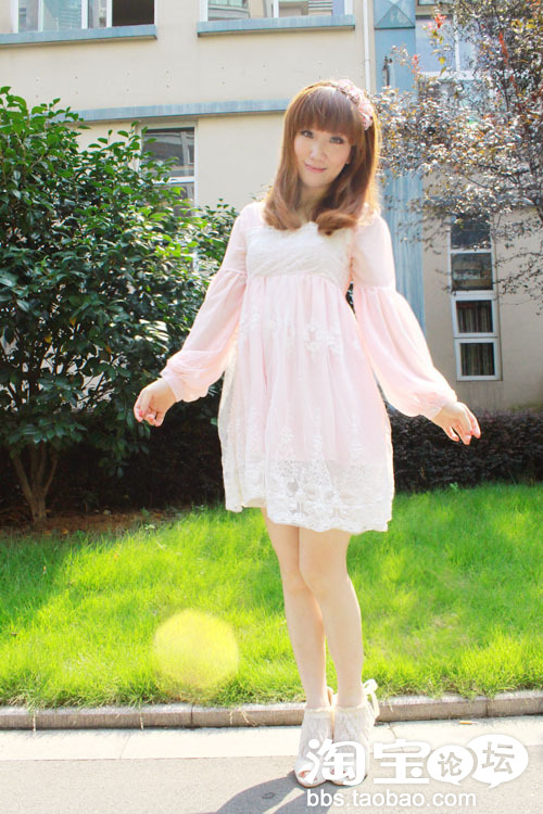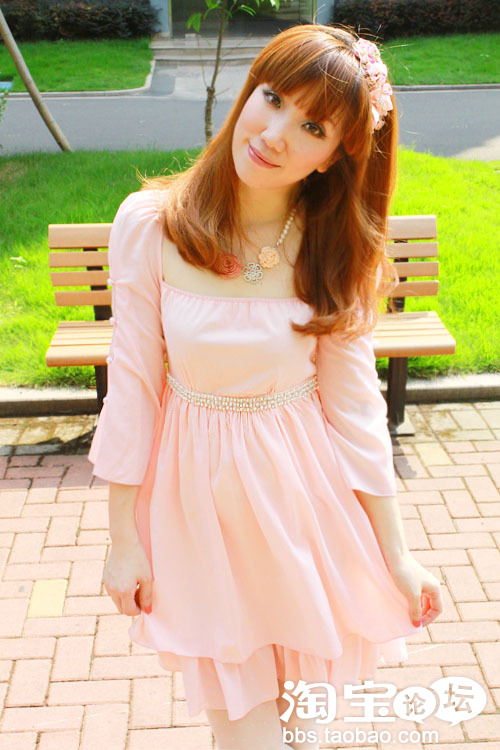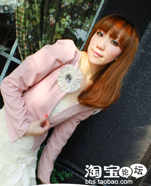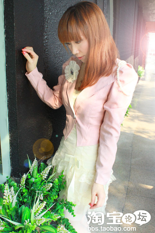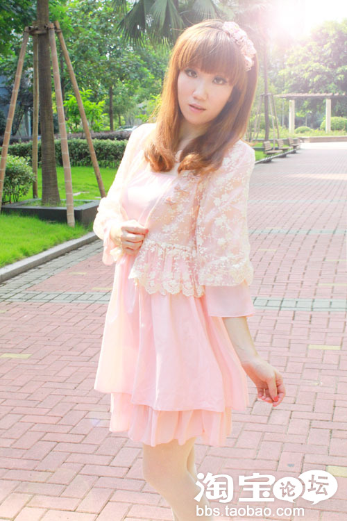 4、粉色绣花蕾丝外套 披肩+雪纺珍珠边洋装