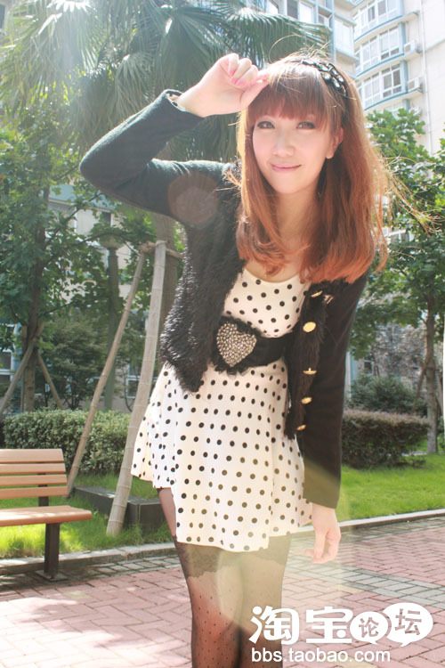 洋溢着公主般高贵的气质。波点连衣裙搭配毛毛外套是最受日本MM欢迎的搭配,