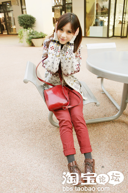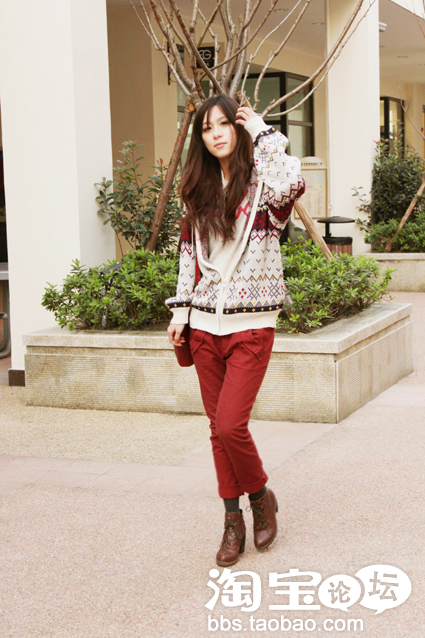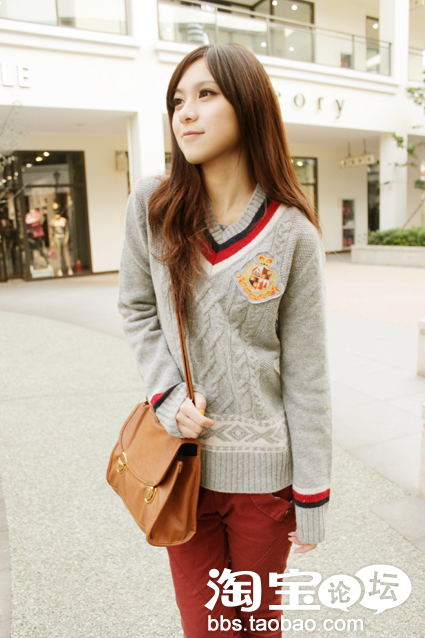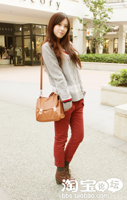 ★英伦学院风灰色毛衣(北欧风提花毛线外套)+红色铅笔裤+复古挎包★