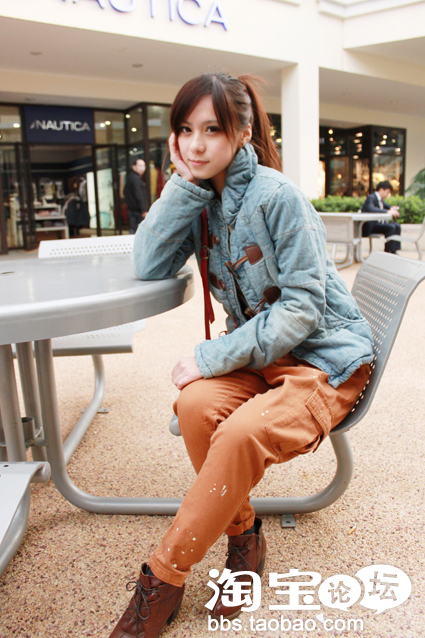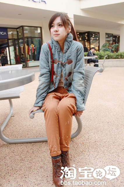 ★牛仔排扣圆领小棉衣+复古打底衫+油漆喷点锥形裤+红色漆皮复古包★