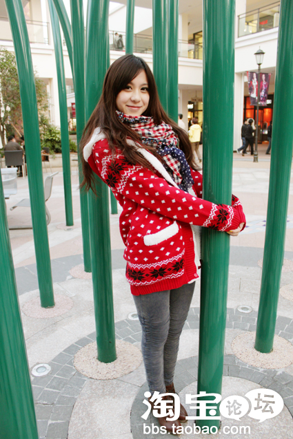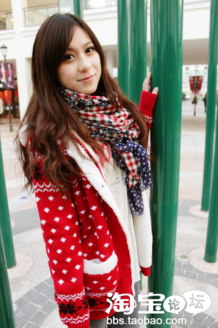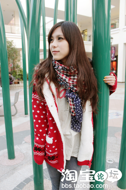 ★红色提花加绒毛线外套+红格子围巾+蓝色打底裤★