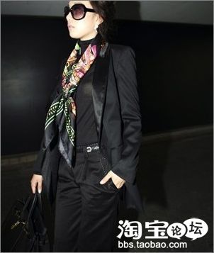 黑色长款西服用光泽感来增加效果,对比明显的丝巾彰显品位。简单的打个结就帅气的很。