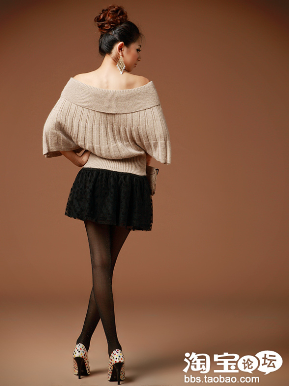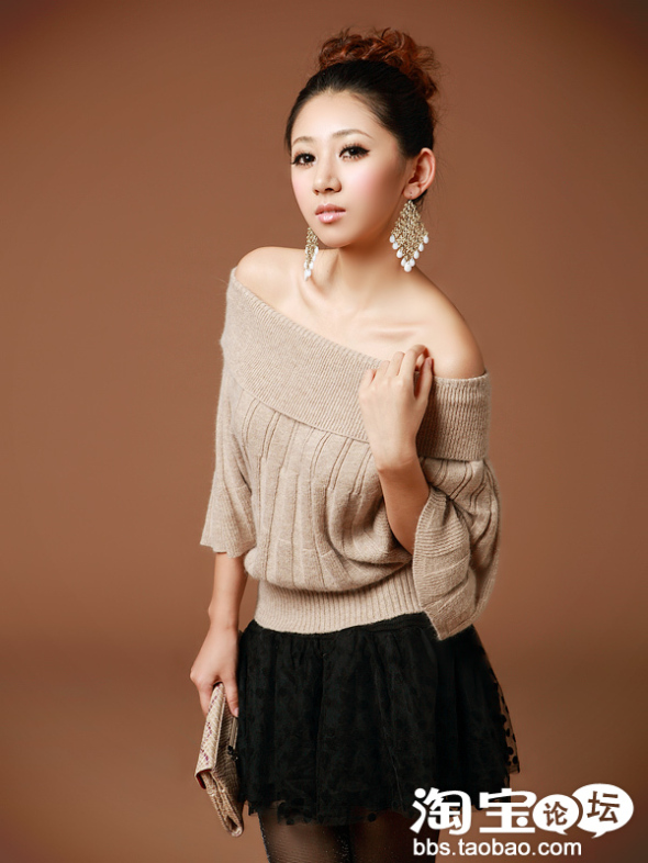 心动女生一字领蝙蝠袖高腰披肩款毛衣米色