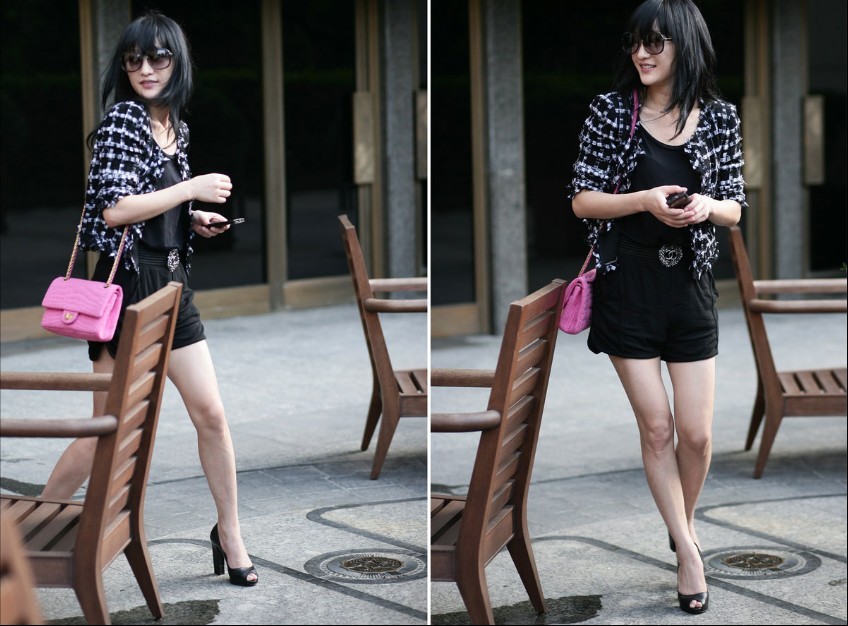 软呢外套:CHANEL 2011早春度假系列;T shirt:Alexander Wang,皮裙:American Apparel,包:CHANEL Coco Cocoon