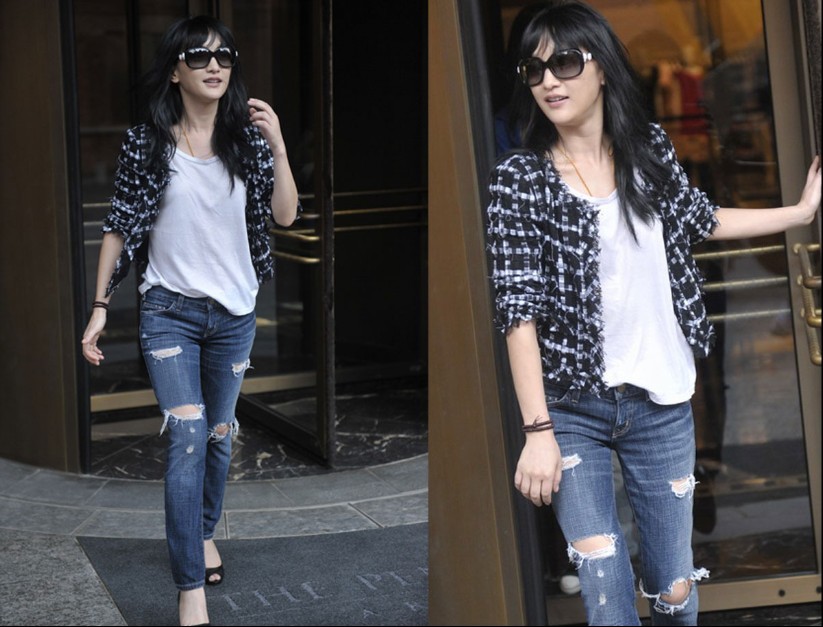周迅:“平日穿着牛仔裤机会比较多,因为很百搭,但这个原本破洞颓废感的牛仔裤和优雅的CHANEL外套混搭却有一种别样的风味,牛仔裤反而变得不那么休闲了。”