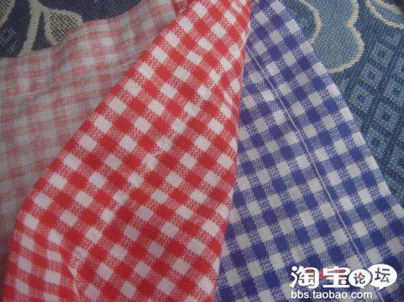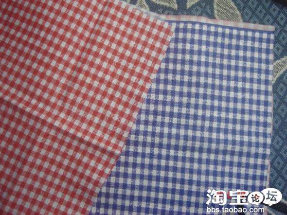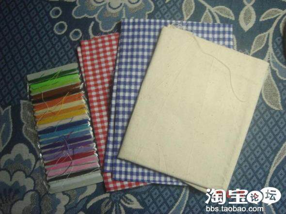 材料:红、蓝格子布料两片,麻料布一块(可以选择做成红蓝格两面的或红+麻,蓝+麻面的),绣线若干。