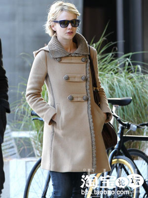 军装风格的设计最近一直都很受时尚人士的欢迎,Carey Mulligan这件军装风格大衣还拥有几个细节看点--驼色、钩花花边、毛衣领,为简洁的大衣增添了更多甜美和明快的感觉。下面搭配一条普通的牛仔裤或者靴子和冬裙都会很好看。直身款的大衣轻松勾勒出肩部轮廓,让整体挺拔高挑,就算小个子的女孩儿也能穿出完美身材比例,不过大衣的长度最好刚过**,太长就容易显矮了。