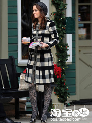 《绯闻女孩》中的另一位女主角Leighton Meester也穿了一件格纹的大衣,很有英伦风格。不过她这件相对更成熟优雅一些,军装铜扣的设计结合流畅的修身造型设计都突出了QUEEN B的名媛气质,下面搭配性感的蕾丝钩花丝袜和蝴蝶结装饰高跟鞋,女人味十足。
