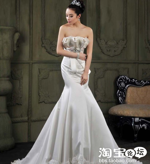 其实在选择这种款式的婚纱的时候,腰收的怎么样特别重要。腰要是完全收的很合身,完全可以把胸部的布料挺起来,衣服怎么也不会往下面掉的。哪怕你是Acup,衣服是Ccup。(说得夸张了点)。腰的版型还要考虑这几点。