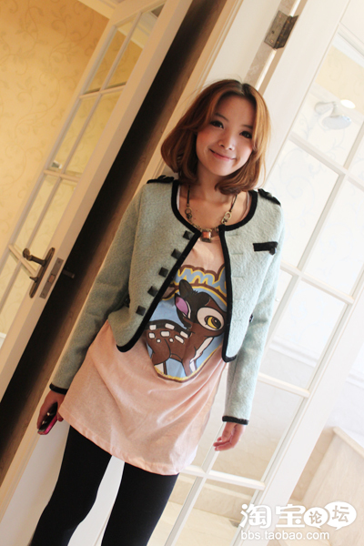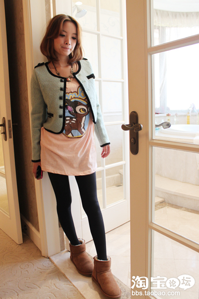 用休闲可爱的小鹿T作为打底 上面搭配的是香香风小短装呢子美衣