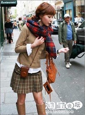 简洁的V领套头针织衫与格纹裙组合,打造充满淑女气质的优雅造型。稳重的浅咖色带出浓郁的秋日气息,格纹围巾是点睛之笔。