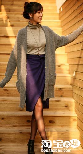 灰色的毛绒毛衣让人不禁想起小时候妈妈织给我们的温暖牌手工毛衣,大大的长款毛衣外套暖暖的包裹着你的身体感觉就像妈妈怀抱般温暖。紫色的高腰铅笔裙让你在灰色中显现出来,修身的设计让你更具知性气息。