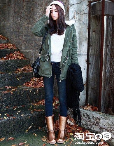 简单的搭配也能十分亮眼,一身朴素风格的造型配上军绿色的帽子大衣同样好看,一双金色的雪靴搭配起来感觉非常in哦,在阳光下闪闪发光的雪靴是秋冬搭配的重点,潮女必然喜欢!