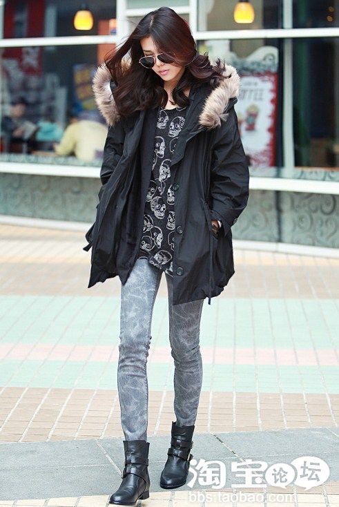朋克风的长款T恤非常有潮味,搭配非常in的瘦腿裤,型女look的街头造型让你分外夺目,宽松的帽子大衣穿起来也不会显得过于臃肿,是秋冬搭配的最佳单品!