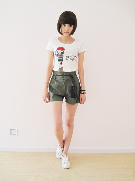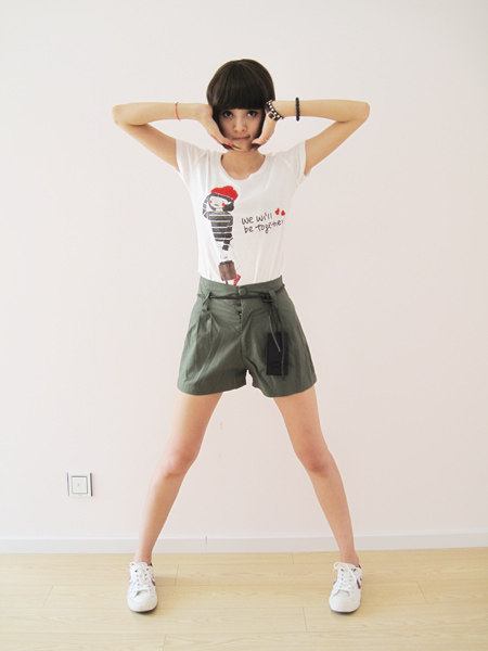 可爱的小红帽T恤百搭的款式啦,搭配军绿色的休闲高腰裤简单利落。