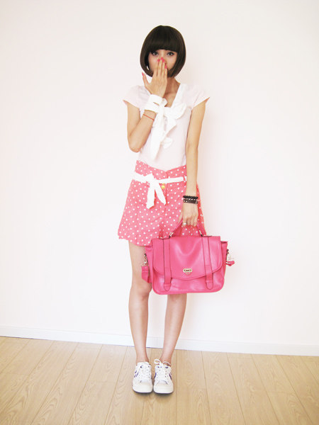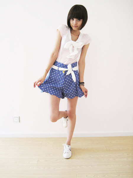NO.1 韩版荷叶边蝴蝶结粉色T+圆点蕾丝腰带高腰裤+帆布鞋+枚色公文包