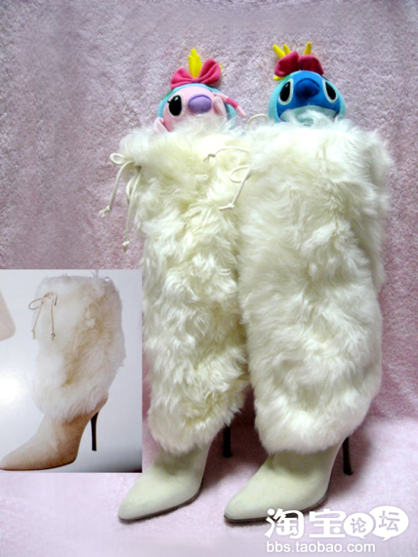 鞋跟9厘米,意大利制,2010年秋冬走秀款,此款超赞的羊羔毛高筒美靴,本季不可缺少的配件之一,CHANEL与D&G推出的爱斯基摩毛毛靴是本季明星与时尚名媛大秀的重点,爱纱败的此款羊羔毛与鹿皮搭配的毛毛靴时尚中不失女人味,高贵与奢华的相结合让白白的毛毛靴出尽了风头,本季最爱的美靴非它莫属了!爱纱败了12000元