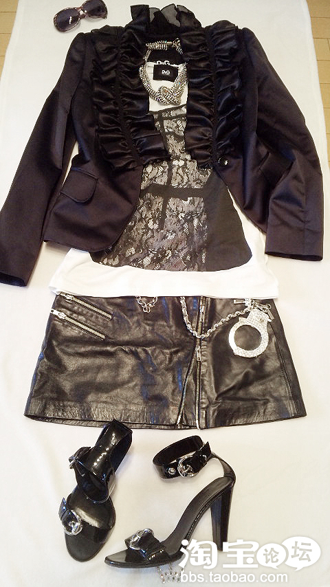 此款Dolce&Gabbana的2010年走秀款T恤加花边领小外套搭配ZARA的小羊皮超短迷你裙,绑带款GUCCI凉鞋营造个性气氛,爱纱一共败了12000元